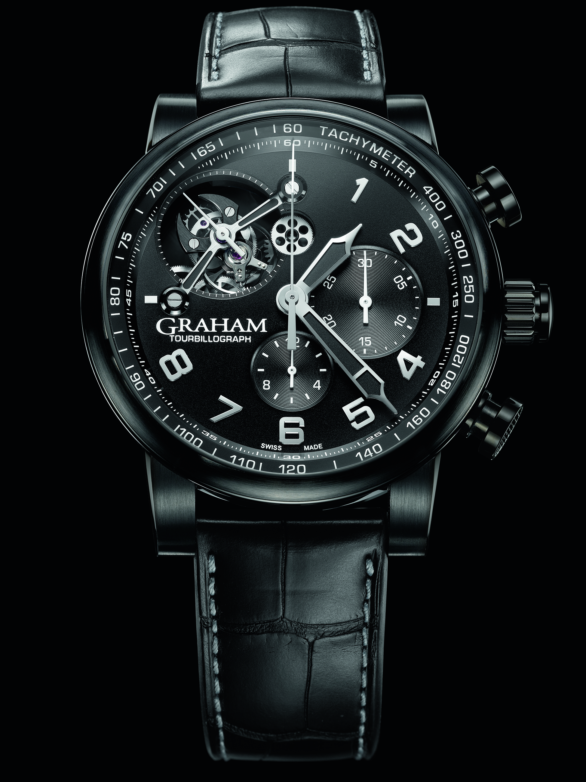 A maior especialidade do bem recheado catálogo da Graham: o Silverstone Tourbillograph alia a mais nobre (o turbilhão) à mais popular (o cronógrafo) das complicações relojoeiras num relógio de prestígio pronto para ser utilizado em qualquer circunstância. A combinação do cronógrafo com o turbilhão é rara mas não inédita – a novidade tem a ver com o facto de se tratar de um calibre alimentado por corda automática, para além de o turbilhão, protegido por duas patentes e com um peso inferior a meia-grama para as 48 peças que o compõem, ser extremamente robusto e poder ser utilizado em actividades mais radicais. Entre os vários modelos equipados com o calibre Tourbillograph, destaca-se esta versão em ouro rosa 18 kt com mostrador preto.
