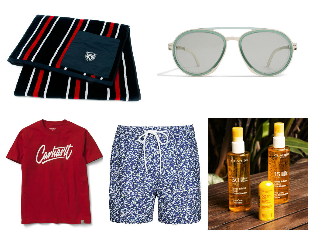 Toalha Giovanni Galli, óculos Mikita na André ópticas ou WrongWeather, T-shirt Carhartt, calções de banho Purificación Garcia e protecção solar da Clarins