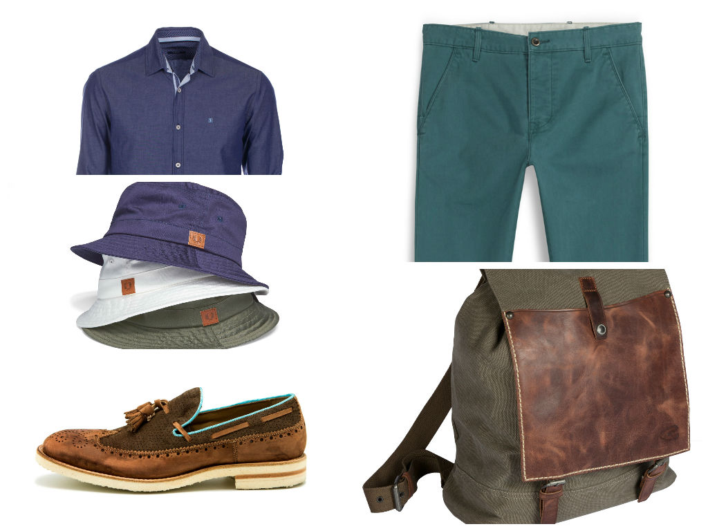 Camisa Lion of porches, calças Red Tab Levi’s, Chapéu-panamá Fred Perry, sapatos cohibas e mochila Camel.