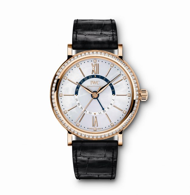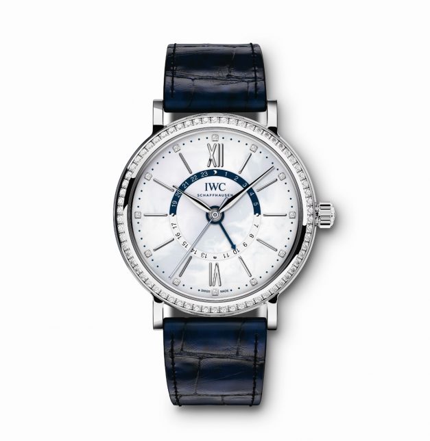 Para uma orientação mais rápida, a metade inferior, das “6” às “18 horas”, é branca e a metade superior, das “18” às “6 horas”, azul, distinguindo visual­mente as horas do dia das da noite. O mostrador em madrepérola reluzente branca faz realçar o azul escuro do semicírculo e do pequeno ponteiro do fuso ho­rário. Os reló­gios estão disponíveis  em caixa de ouro vermelho (ref. IW459102) ou caixa de aço inoxidável (ref. IW459101), combinadas com bracelete em pele preta ou azul-escura de aligátor da casa Santoni. Como opção, está disponível uma bracelete em malha milanesa em aço inoxidável ou em ouro vermelho de 18 quilates.