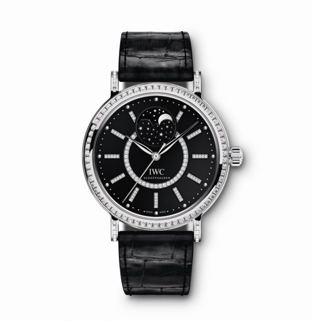 O Portofino Midsize Automático Fase da Lua em ouro branco (ref. IW459004) é o navio-almirante da nova coleção Midsize. O seu preto meia-noite cria um pano de fundo eficaz para os diamantes que se apresentam com um branco puro. Os desenhadores de Schaffhausen modelaram, pela primeira vez, toda a indicação das fases da Lua como céu noturno estrelado, em que a Lua e as estrelas parecem pairar no espaço – uma imagem poética que se repete no círculo interior do mostrador engastado de diamantes e na caixa enfeitada com 90 pedras precio­sas. Índices de diamantes em forma de barra circulam em torno do centro do mostrador como uma auréola, enquanto que índices puntiformes na margem descrevem as suas órbitas como planetas. As 174 pedras preciosas no mostrador, na luneta e nos encaixes da bracelete foram posicionadas de forma balanceada, fazendo com que o ornamento luxuoso se integre harmoniosamente na linguagem sóbria do relógio. O relógio é usado com bracelete de pele preta de aligátor da casa Santoni.