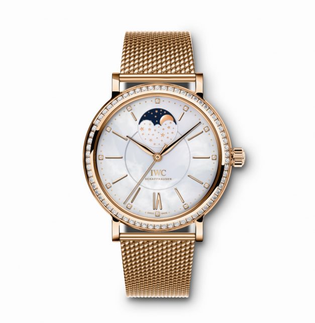 Com o novo Portofino Midsize Automático Fase da Lua, os designers da IWC recorreram ao charme e elegância dos anos 50 e 60 para criar uma interpretação moderna do luxo. A indicação das fases da Lua é apresentada em diferentes cenários , num fundo com nuvens ou a pairar num céu estrelado. A indicação das fases da Lua é um elemento distintivo da linha de relógios Portofino – tal como a numeração romana, o ponteiro foliforme e o vidro da frente bombeado.  Cinco novos modelos Portofino Midsize Automático Fase da Lua são agora apresentados com diamantes, Lua e estrelas: uma variante em ouro branco (ref. IW459004), três em ouro vermelho (ref. IW459002/IW459003/IW459005) e uma em aço inoxidável (ref. IW459001).