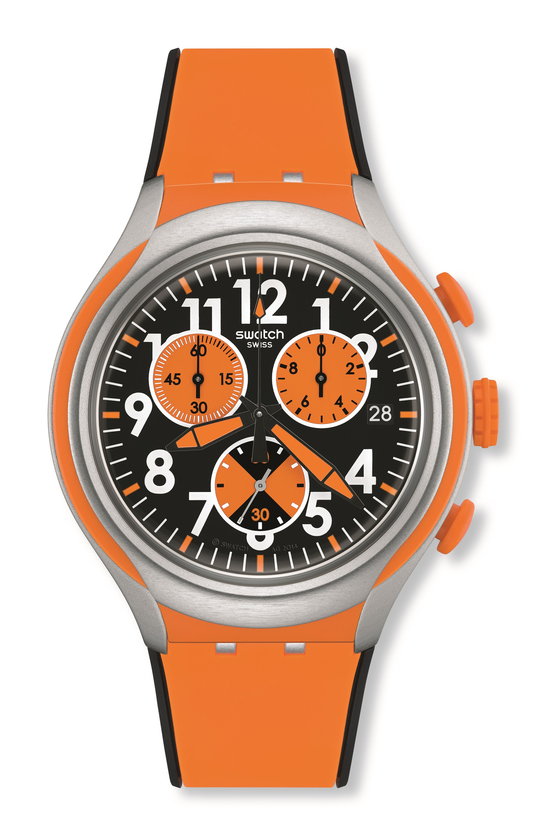 Caixa: Alumínio com plástico cor de laranja opaco, botões de função cronógrafo e coroa cor de laranja
