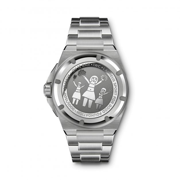 A gravura no fundo do relógio representa o desenho de uma menina oriunda do Uganda, que ganhou o concurso infantil de desenho da IWC. A cooperação com a Laureus é um dos muitos empenhamentos sociais e ecológicos que a IWC Schaffhausen persegue por partilhar os valores desta fundação.