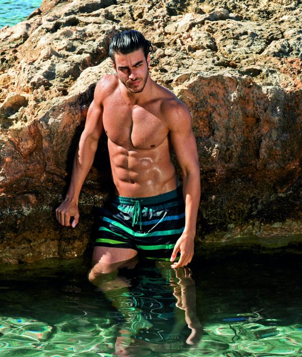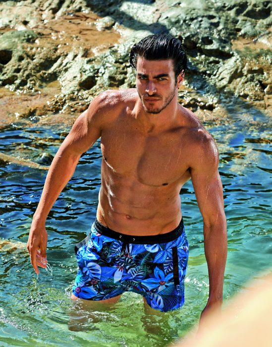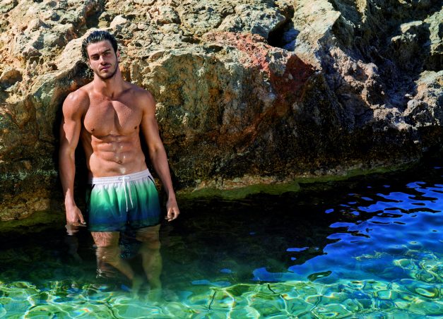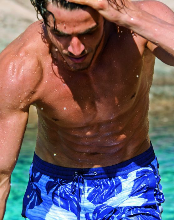 Muita cor e padrões também na colecção de homem com tons como o esmeralda e o verde petróleo combinado com salpicos de verde ácido e até de roxo… sombras azul marinho e notáveis detalhes não apenas na linha de beachwear, mas também nas confortáveis peças de denim para usar fora da água.