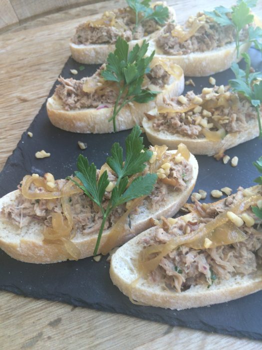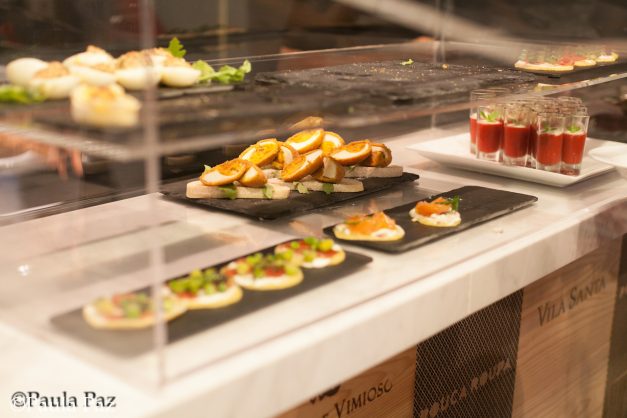Foi uma pequena marcha de petiscos que passaram por nós, desde de Bruschettas de queijo brie e mel com pimenta rosa, estupeta de bacalhau, croquetes de alheira, uma belíssima bruschetta de pato com cebola caramelizada e nozes passando por blinis de salmão ou presunto.