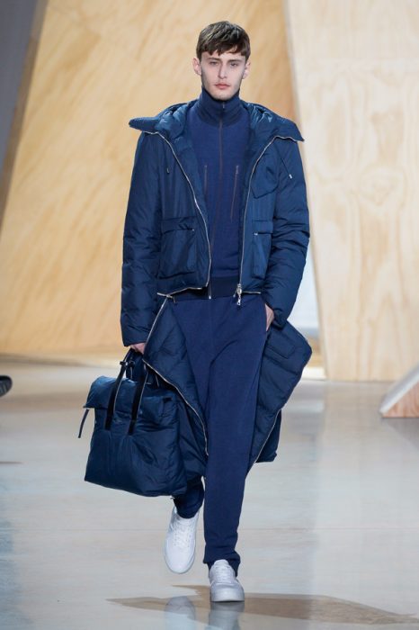 As peças vestem-se e despem-se de imediato, como uma saia em veludo acolchoado de cintura elástica. Os acessórios são híbridos e integrados. Luvas surgem dentro das mangas dos casacos e um capuz dissimula–se nas dobras de uma écharpe.