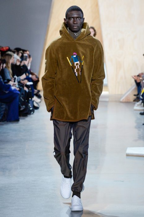 Os jogos de computador dos anos 80 inspiram bordados de pinheiros e esquiadores pixelizados que atravessam vestidos em formato poncho ou fatos de treino.