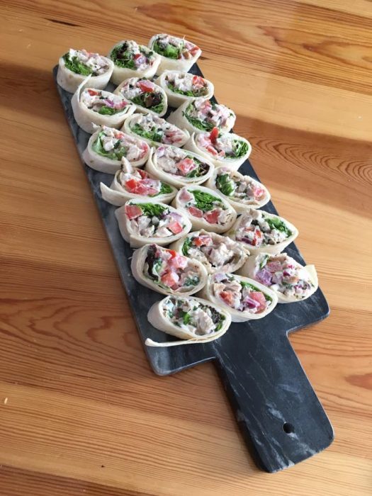 – Duas sandwiches, uma focaccia de frango asiático com maionese de ervas e um panini de cogumelos, queijo edam e vinagre balsâmico;