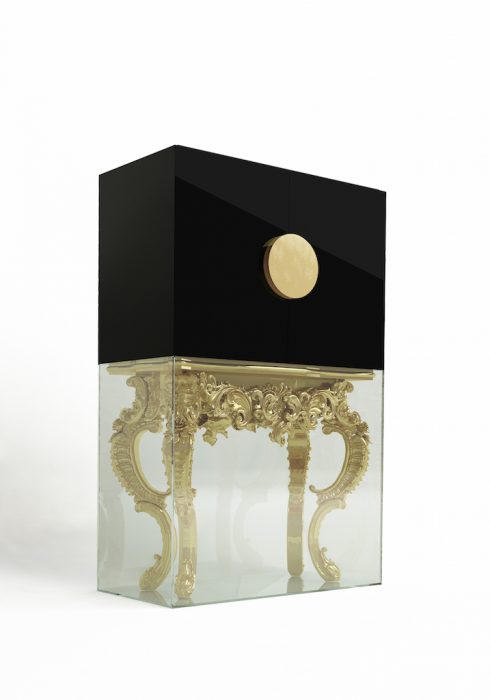 A edição limitada FIRST é um móvel requintado, uma explosão de sentidos. Todo o exterior é revestido a azulejo preto em mosaico de vidro brilhante. Quando as portas deste cabinet se abrem com o seu interior esculpido à mão transporta-nos para outra dimensão de luxo com um interior integralmente forrado em folha de prata.