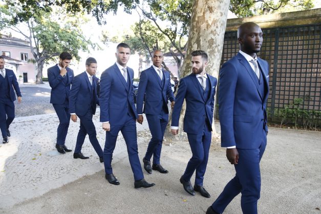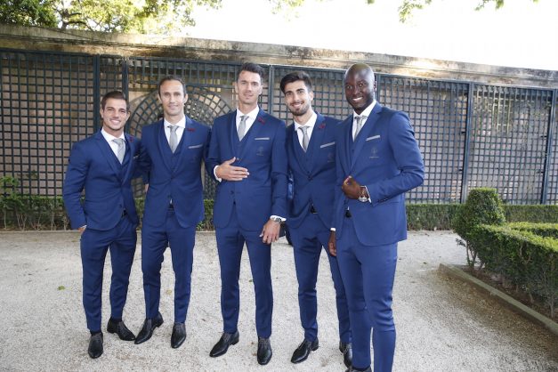 O fato oficial, de vestibilidade slim fit em construção semi-tradicional, pertence à linha Private, um modelo premium da DIELMAR que respeita o conceito e a tradição da alfaiataria, mas alia um toque de design e modernidade num registo jovem e slim.