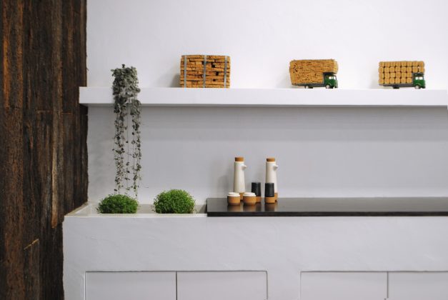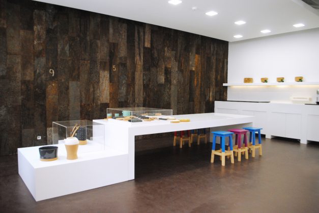 A decoração minimalista e clean, com uma predominância de branco, cria um visual moderno e convidativo, evidenciando a essência e textura da cortiça. Existe na loja uma zona que apela à alma da Pelcor: uma parede revestida a cortiça no seu estado natural.