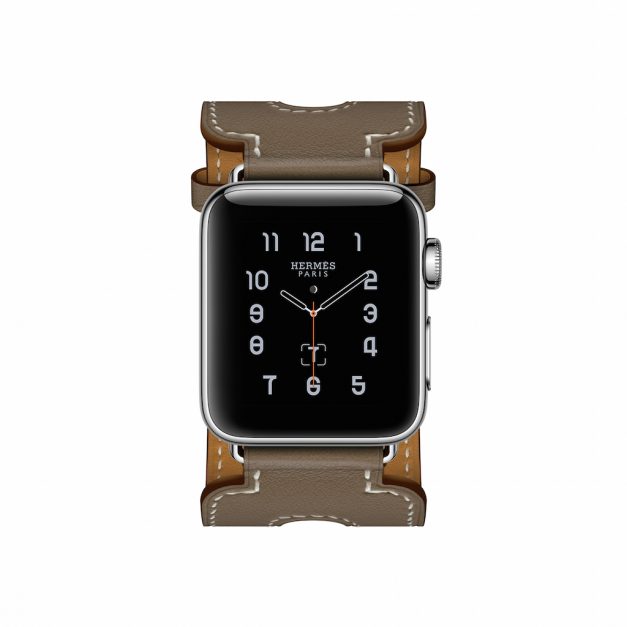 Esta expansão da coleção Apple Watch Hermès inclui um novo estilo – a dupla fivela Cuff em couro e pele de bezerro, inspirado nos desenhos de sandálias de Pierre Hardy, diretor criativo de sapatos e jóias Hermès, enquandrando elegantemente o punho em novas cores como Rosa Jaipur, Étoupe e Azul Àgata.