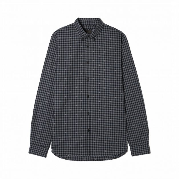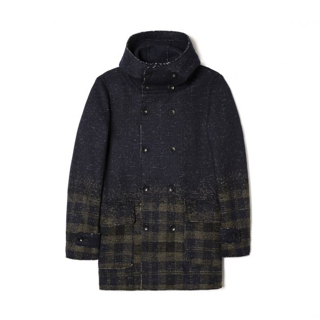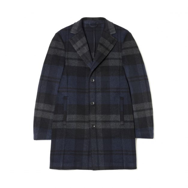 Para compor o look, a Sisley propõe um casaco hipercontemporâneo com gola subida e fila de botões dupla em padrão Príncipe de Gales dégradé.