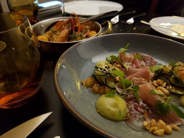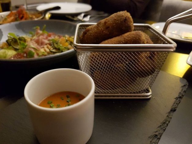 Temos a recomendar os croquetes, nossos conhecidos do Porto, com molho de cebola fumada, camarões com malagueta e macieira de entrada e o tataki de atum.