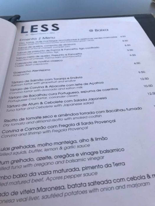 O Less Baixa é o local ideal para um copo de vinho – muitas referências são até assinadas pelo próprio chefe – ou uma sangria da casa. A carta é servida o dia todo, de segunda a quarta apenas até às 20.00, mas abre ao jantar, até à 00.00, de quinta a sábado.