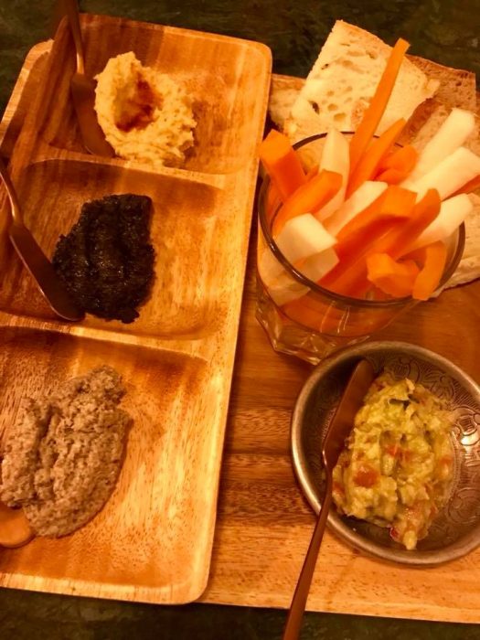 Encontramos um menu do NAKED natural, saudável, sem aditivos ou preparações nocivas ao organismo, rico em frutas e legumes, e sempre com opções. Começámos por uma vichyssoise de batata doce, com creme de beterraba e dukkah e Mezze, húmus com palitos de vegetais e pasta de cogumelos e azeitonas.