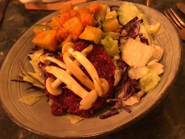 Como prato principal, burger de quinoa com cenoura e beterraba com molho de mangericão e legumes assados. Temos de assumir, que não sendo a nossa preferência, surpreendeu-nos muito esta forma de apresentação de burger. Uma surpresa pela positiva.