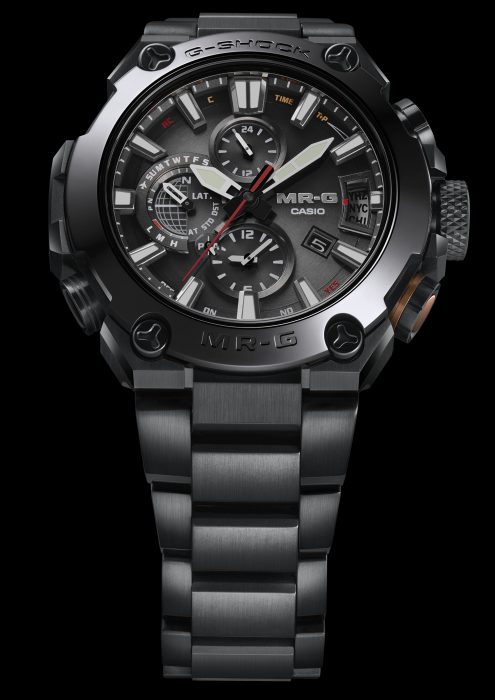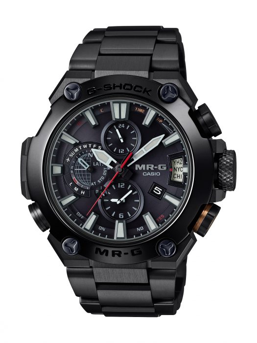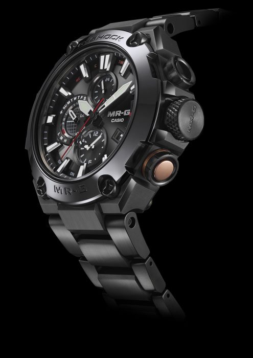 Com base no tema Kuro-Zonae (“Black Guard”), uma unidade de guerreiros samurai que usava todas as armaduras escuras, todo o acabamento do relógio foi unificado em vários tons de preto. O design expressa o look sólido e a força da série MR-G. Evocando a aparência de uma armadura de samurai preta, o bisel é feito de COBARION®, um novo material que é duas a três vezes mais resistente do que o aço inoxidável, proporcionando excelente resistência ao desgaste.