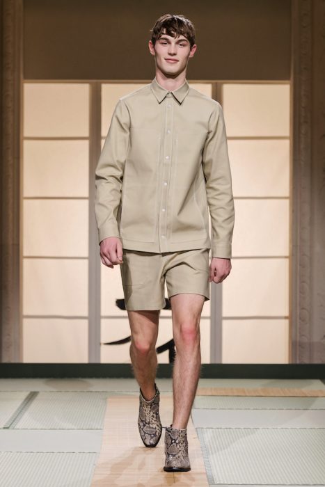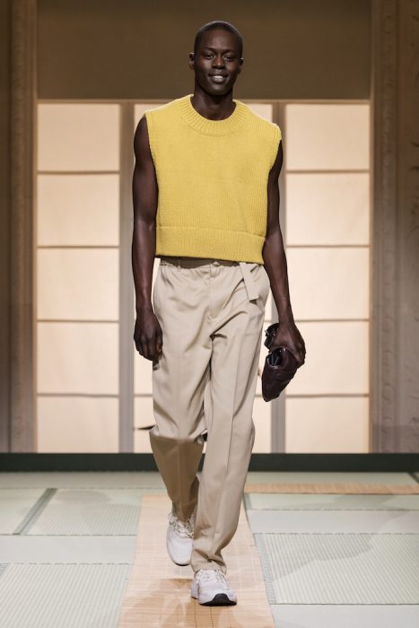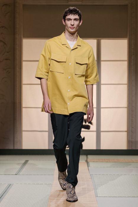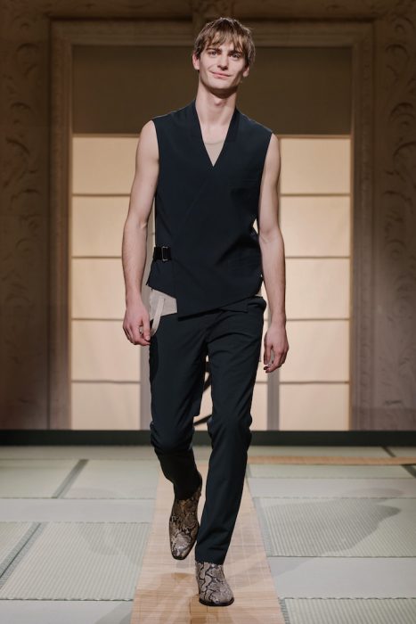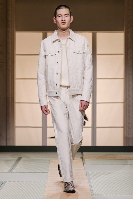 A colecção H&M Studio apresentou silhuetas sóbrias e descontraídas, assim como um estampado abstrato impressionante, inspirado na caligrafia japonesa. Peças workwear com corte acentuado, materiais fluídos e malhas statement também contribuíram para a sensação de equilíbrio entre design minimalista, cores puras e movimento.