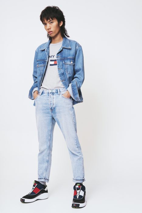 As peças femininas incluem um casaco de veludo com capuz branco com TOMMY JEANS de grandes dimensões escrito na parte de trás, uma camisola amarela neon, casaco em ganga vermelho com a bandeira e TOMMY JEANS nas costas, jeans azuis, calças largas e um vestido azul claro. As peças masculinas incluem um casaco de veludo, um casaco de ganga com estilo náutico na parte de trás, camisola amarela néon, hoodie branco com TOMMY JEANS escrito no braço, jeans azuis e calças chinos confortáveis.