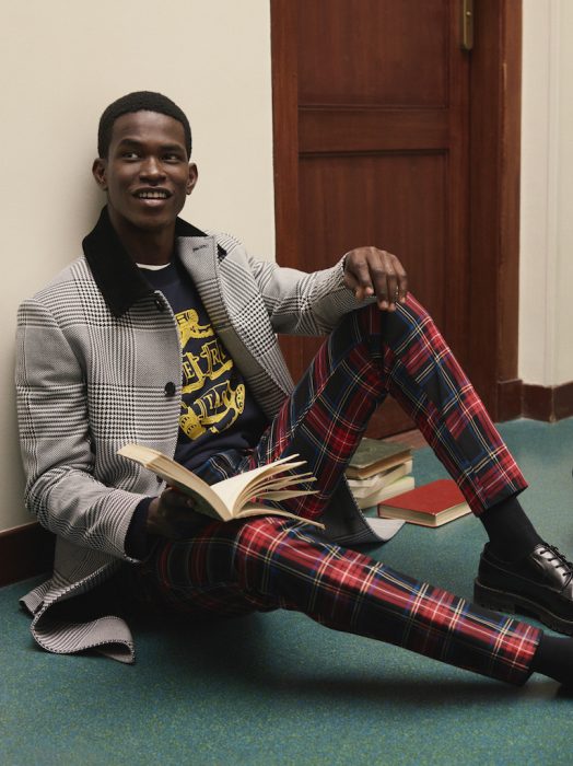 Destaque para a canadiana retro, casaco acolchoado curto em xadrez e para o casaco em lã reciclada com gola de bombazine. As calças em bombazine azul-marinho são o par perfeito para o pullover varsity, assim como para a camisola com o emblema da Universidade Harvard. Para completar o look, um gorro em lã com padrão argyle.