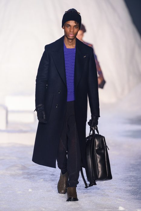 “Estamos focados em expandir o uso de técnicas tradicionais, criando formas híbridas que se adequam a novos usos, adaptando o artesanato tradicional às funções contemporâneas”, afirma o Director Artístico da marca Ermenegildo Zegna, Alessandro Sartori. “Trabalhamos em torno de neologismos sartoriais, sendo que esta temporada surge um novo neologismo que apelidei de: Snowriting. O lado formal emerge no informal num cenário sublime de neve”.