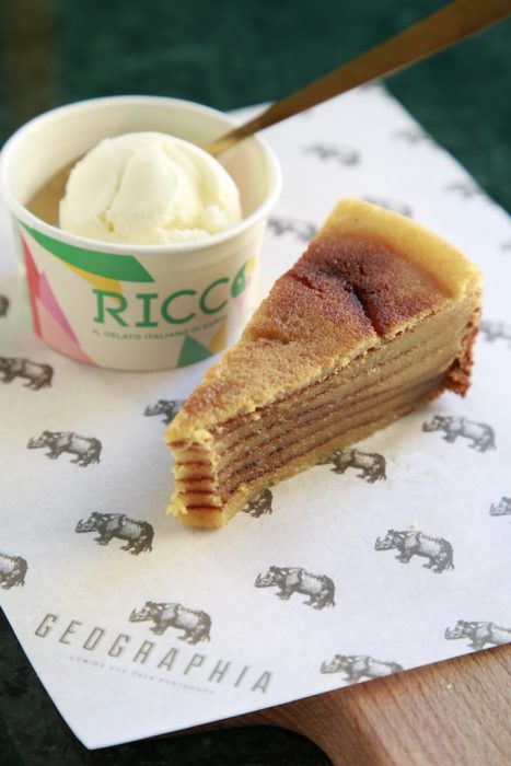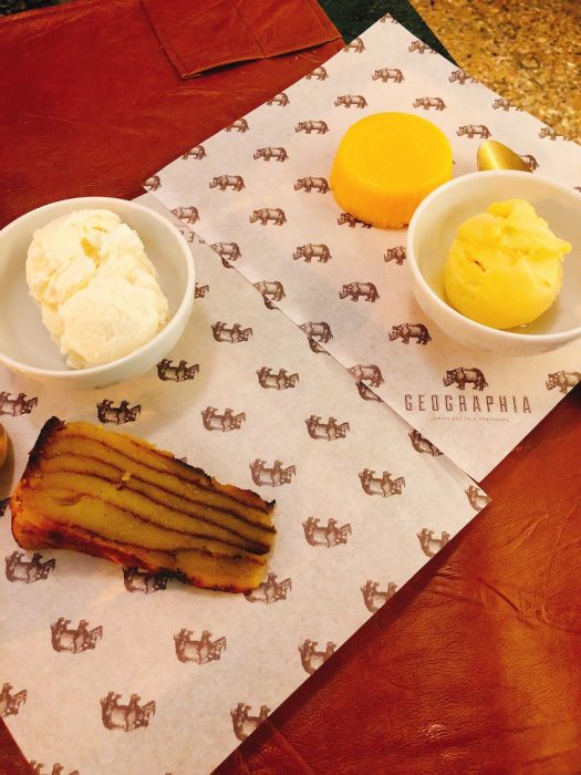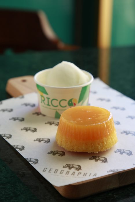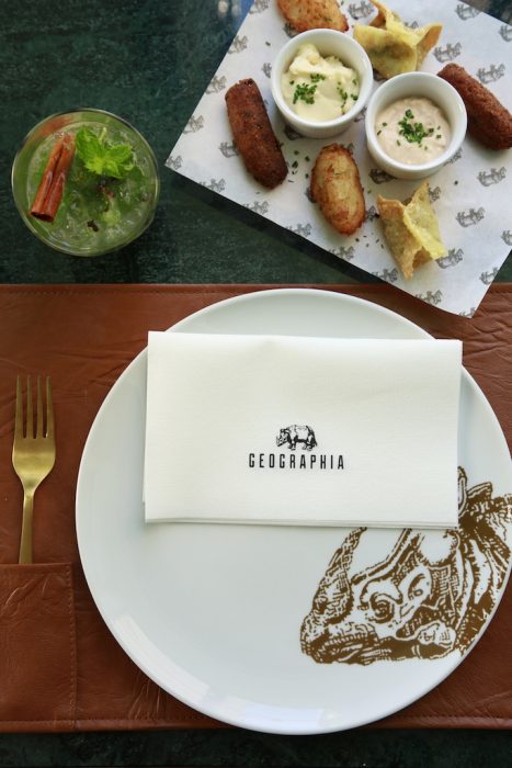 No GEOGRAPHIA são ainda servidos produtos exclusivos, que serão comercializados em breve. Dois picantes caseiros de diferentes intensidades, chá “Boa Esperança” (um blend de rooibos da Cidade do Cabo, erva-mate do Brasil e erva-príncipe) e o café GEOGRAPHIA (grãos selecionados em pequenos produtores, torrados a lenha da forma tradicional: Timor, São Tomé, Cabo Verde, Brasil (Arábica) e Angola (Robusta)).