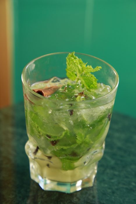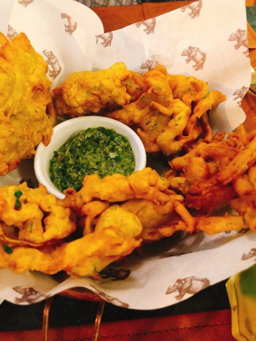 A refeição foi uma verdadeira viagem pelos vários sabores, uma verdadeira passagem, através dos sabores e dos pratos, por várias regiões e povos. Com uma caipirinha como deve ser. Começamos com uma pequena delícia que faz parte das minhas recordações natalícias, bojés Os bojés são uns pastéis, cuja base é farinha de grão e cebola. São servidos como acepipes simples ou acompanhados com um patê, neste caso o chutney de coentros. Uma verdadeira delicia.