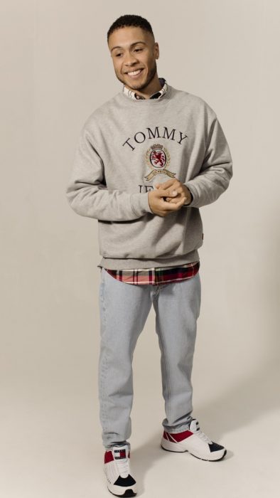 As peças icónicas masculinas incluem um trucker denim e um blusão xadrez em azul e verde com o logo Crest bordado e “TOMMY JEANS” lettering nas costas; branco, encarnado ou navy sweaters com o logo estampado nas costas, braços e peito em frente à bandeira do logo TOMMY JEANS; sweaters cinzas, encarnado, ou navy com bordado Crest e lettering “TOMMY JEANS” na frente; dad jeans com lavagem  clara e média com bordado Crest no bolso de trás; jardineiras brancas com o logo Crest em frente à bandeira TOMMY JEANS na frente; calças fato de treino em navy ou encarnado com logo Crest estampado na lateral da perna; uma camisa xadrez em vários tons com logo Crest pequeno bordado no boldo do peito; e ainda t-shirts encarnadas, brancas ou navy com logo Crest no peito à frente da bandeira TOMMY JEANS.