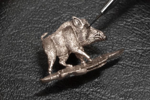 A gravação é a técnica dominante no segundo novo par destas peças de edição limitada: o Petite Heure Minute Porco. Aqui, um porco selvagem é retratado em frente a oito carvalhos. O número oito tem um especial significado para a cultura chinesa, que o vê como um número de sorte, mas também para a Jaquet Droz, cujo emblemático modelo Grande Seconde tem por base a estética do algarismo oito, símbolo do infinito. O impactante carvalho é um símbolo de poder, de longevidade e de força moral e física.