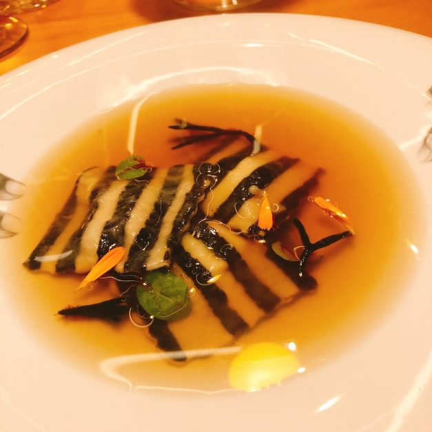 Raviolis de gamba rosa do Algarve e caldo de cozidos das furnas