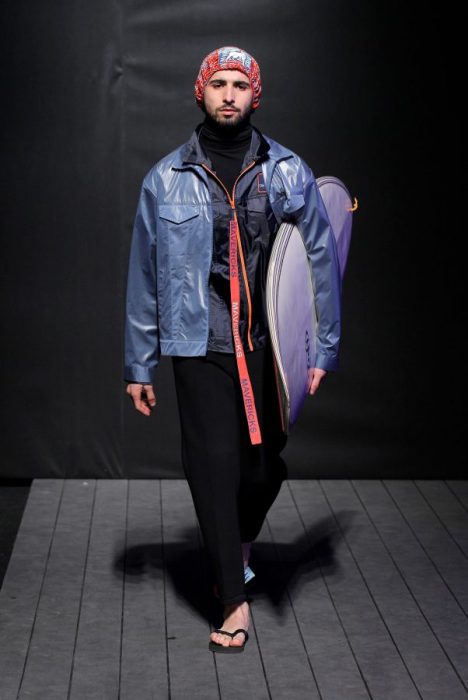 O desfile seguinte foi uma redescoberta da designer Duarte, coleção de Inverno 19/20 muito inspirada no surf e que se mostrou disruptiva com todos os clichês que temos com o surf. obvio que a prancha estava presente mas os cortes e as posturas não eram as mesmas.  “Aqueça-se em camadas de casacos e junte-se aos nossos surfistas cool e radicais, para surfar estas ondas gigantes” como ela diz da sua proposta.