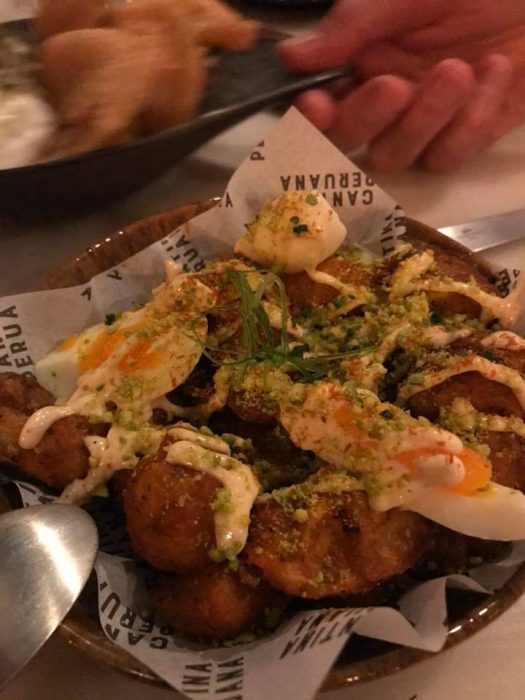 Ora bem, quais foram os nossos preferidos? Difícil mas temos de realçar Anticucho de pollo nikkei, coxa de frango marinada em molho anticuchera nikkei, grelhada, com batata-palha artesanal, sésamo tostado, ají limo e shiso vermelho. Supimpa! E, para entrada, tivemos dois preferidos, papas anticucheras, que são umas deliciosas batatas fritas com pele, em molho anticuchera, com maionese de ají rocoto, criolla, ovos e pistácio. E, as soberbas gambas em tempura com molho tártaro e criolla chamadas de chicharrón de gamba en tempura.