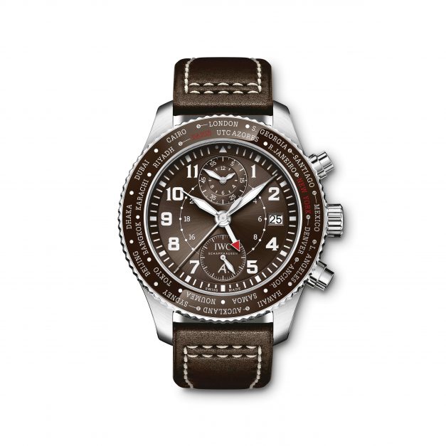 O IWC Pilot Timezoner Chronograph Edition “80 Years Flight to New York” apresenta a função de fuso horário patenteada, que permite ao Utilizar ajustar o fuso horário simplesmente pressionando e girando o bisel. No bisel de cerâmica castanha. As palavras “Paris” e “Nova York” estão assinaladas a vermelho. O mostrador castanho-sépia é inspirado nas fardas dos pilotos da época de Saint Exupéry, e o fundo da caixa apresenta uma gravura do “Latécoère 521”.