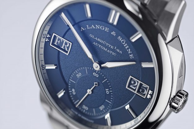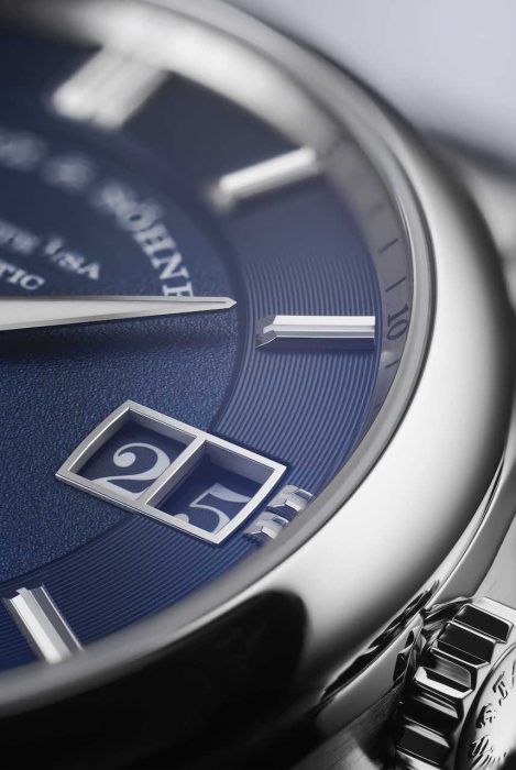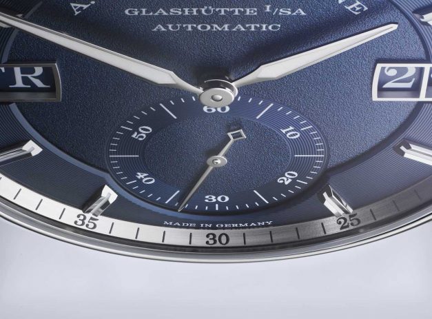 O que primeiro salta à vista no mostrador em tom azul escuro é a nova indicação dupla do dia da semana e da data. Posicionada à direita, a data sobredimensionada típica da Lange apresentada na tradicional janela dupla é complementada por uma igualmente grande indicação do dia da semana no lado esquerdo. Os segmentos verticais exteriores acompanham a curvatura da luneta. A tipografia clássica da Lange é utilizada em ambas as indicações, embora neste caso os algarismos e as letras surjam em branco contra um fundo azul. O novo calibre é formado por 99 componentes individuais.