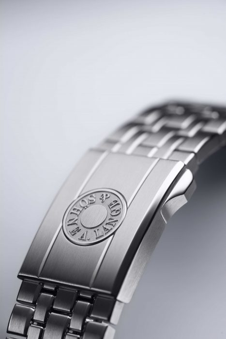 A bracelete em aço inoxidável é extremamente confortável de usar. O seu comprimento pode ser ajustado em pequenos incrementos até 7 milímetros através do fecho de báscula de segurança. Ao pressionar-se o botão gravado com a assinatura da Lange, a bracelete pode ser puxada ou empurrada até se chegar ao comprimento desejado sem ser preciso abrir o fecho. Se necessário, a bracelete pode ser alargada com a adição de mais elos.