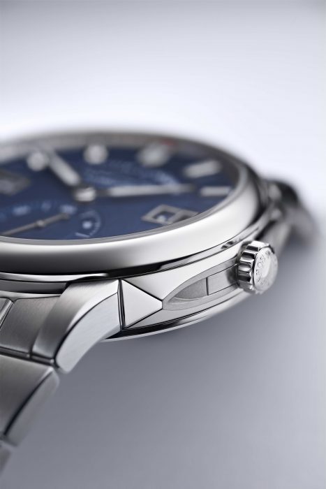 As superfícies são decoradas com um acabamento estriado e as arestas são chanfradas para melhor contraste. Essa combinação entre superfícies escovadas e arestas biseladas também está presente nas asas e nos elos da bracelete maciça em aço inoxidável. Às 2 e 4 horas encontram-se botões especialmente selados para o acerto da data e do dia da semana.