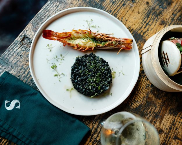 Nos pratos principais destacam-se o Camarão Tigre, com massa pevide, tinta de choco e queijo parmesão, a Empada de Novilho