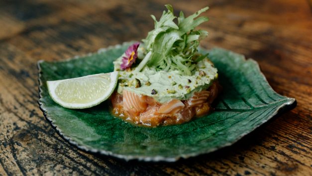 epopeia gastronómica destaca-se o crocante Camarão Panado com Sweet Chilli e o Tártaro de Salmão, com puré de abacate, chutney de manga e pistachio.