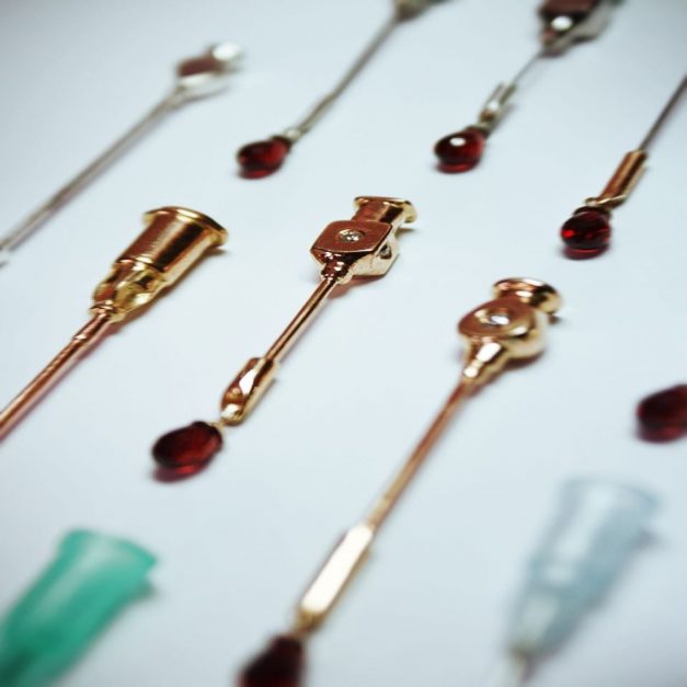 A par da exposição, Olga Noronha apresenta ainda uma estreia: a sua primeira linha de alta joalharia, desenvolvida a convite, e em exclusivo, para a Boutique dos Relógios Plus.Trata-se de uma colecção de jóias, onde os materiais médicos, nomeadamente as agulhas, se vestem de gemas e metais preciosos, para dar vida e corpo a colares, anéis, brincos e pregadeiras.