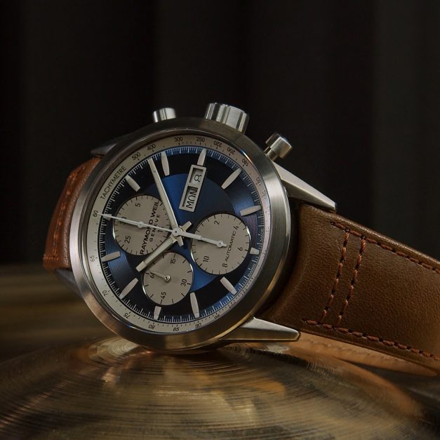 Um relógio com charme natural. O novo Cronógrafo Raymond Weil surge num surpreendende mostrador azul galvânico, cheio de personalidade.