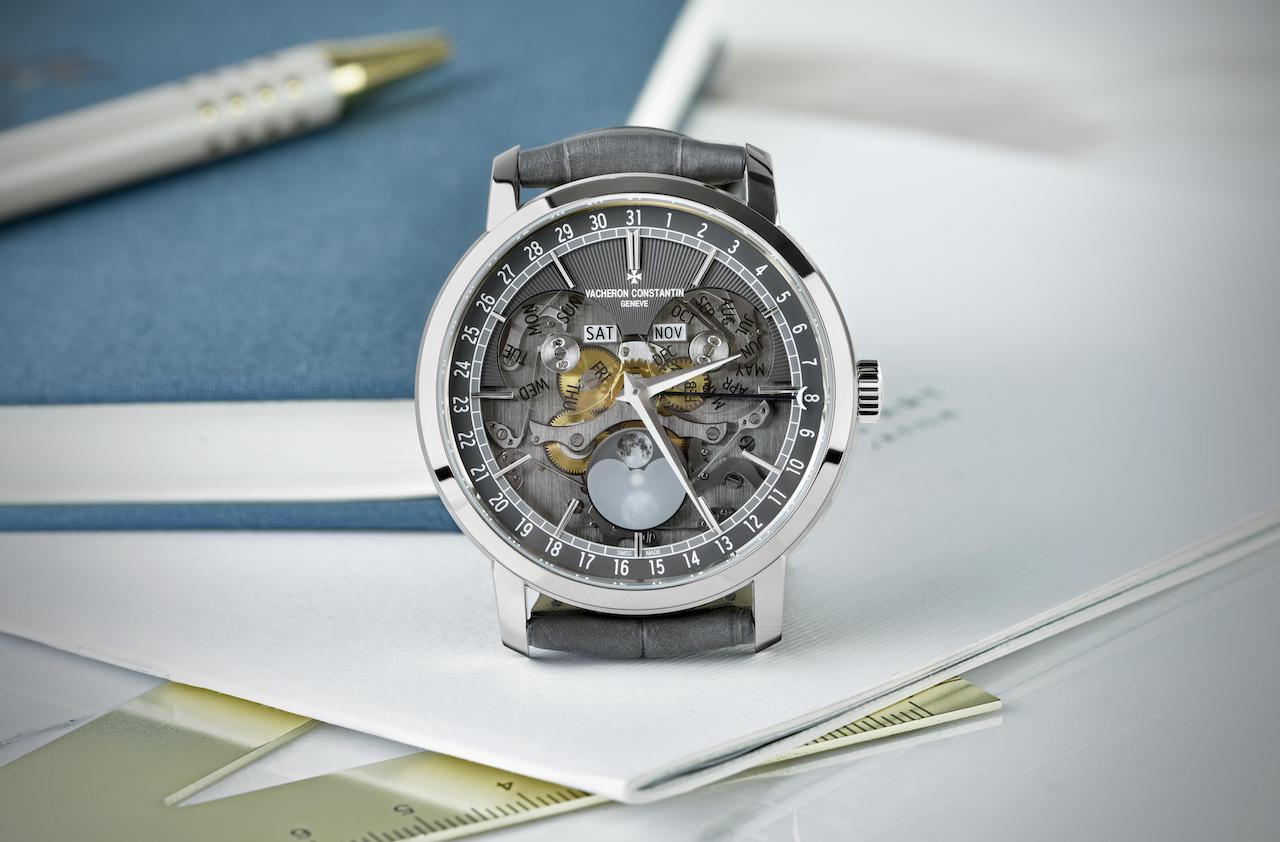 A coleção Traditionnelle da Vacheron Constantin, que perpetua o espírito dos relojoeiros genebrinos do Século das Luzes, assume um estilo muito sofisticado com dois novos modelos equipados com um calendário completo. Emoldurados numa caixa de 41 mm, em ouro branco de 18 quilates ou em ouro rosa 5N de 18 quilates, são disponibilizados numa versão openface com o mostrador em safira aberto. Esta transparência realça os pormenores do Calibre 2460 QCL/2, que assume, por contraste, um tom cinzento-ardósia, obtido através de um tratamento galvânico NAC na superfície. Esta nova versão, que alia o design contemporâneo ao património relojoeiro, relembra o modelo Traditionnelle Twin Beat com calendário perpétuo, apresentado em 2019.