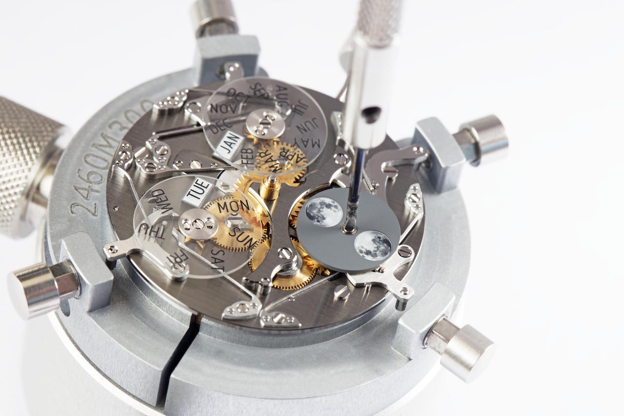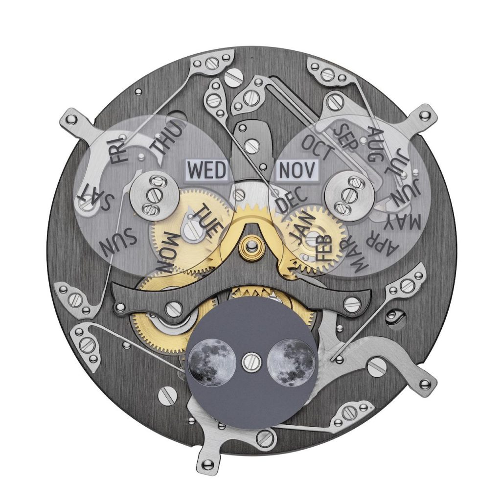 Os atributos característicos da coleção Traditionnelle – a caixa redonda e as asas escalonadas, o fundo canelado, o fino bisel, o ponteiro dos minutos ao estilo caminhos-de-ferro, os ponteiros de duas faces do tipo Dauphine e os índices do tipo palito em ouro branco – incorporam claramente estes dois modelos no acervo relojoeiro da Maison. A abertura na estrutura do movimento, perfeitamente visível de ambos os lados do relógio, num tom cinzento-ardósia, obtido com o tratamento NAC, revela toda a sua potência mecânica. Rodeada por um bordo em opalina com um tom cinzento-ardósia, onde um ponteiro central indica a data, a parte superior do mostrador em cristal de safira exibe um segmento guilloché, também em tom cinzento-ardósia, assim como índices aplicados em ouro. O mostrador tripartido mostra os discos em safira que indicam os dias e os meses, em forma de janela. O disco das fases da lua, com as duas representações realistas do satélite terrestre, está também coberto por uma tampa em safira translúcida. Esta construção aérea permite admirar as diversas peças do movimento, incluindo as pontes e a placa, que apresentam um original acabamento vertical na face.