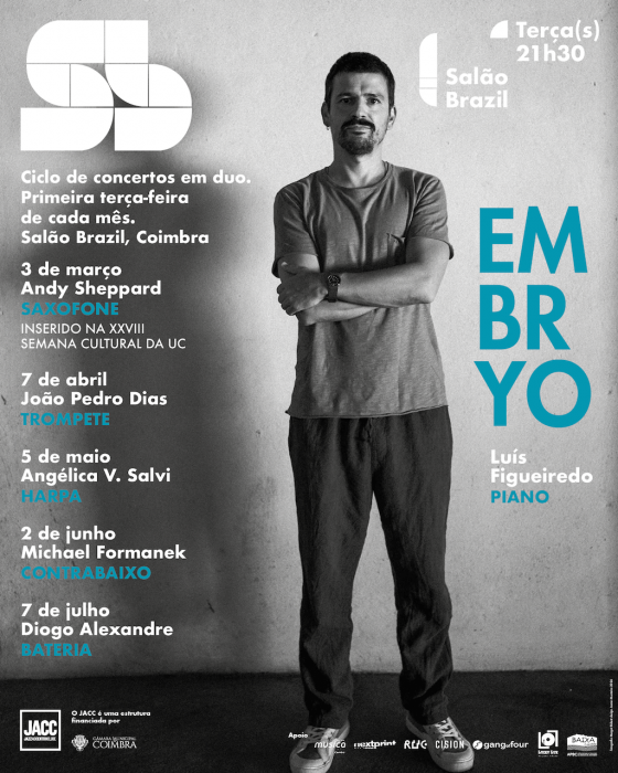 Arranca no próximo dia 3 de março um dos projetos mais relevantes da JACC (Jazz ao Centro Clube) no que diz respeito ao apoio à criação artística. Embryo, concebido pelo pianista e compositor conimbricense Luís Figueiredo, inaugura um modelo que se espera ter continuidade no futuro próximo, reforçando o compromisso da JACC com processos criativos sustentados e colaborativos.