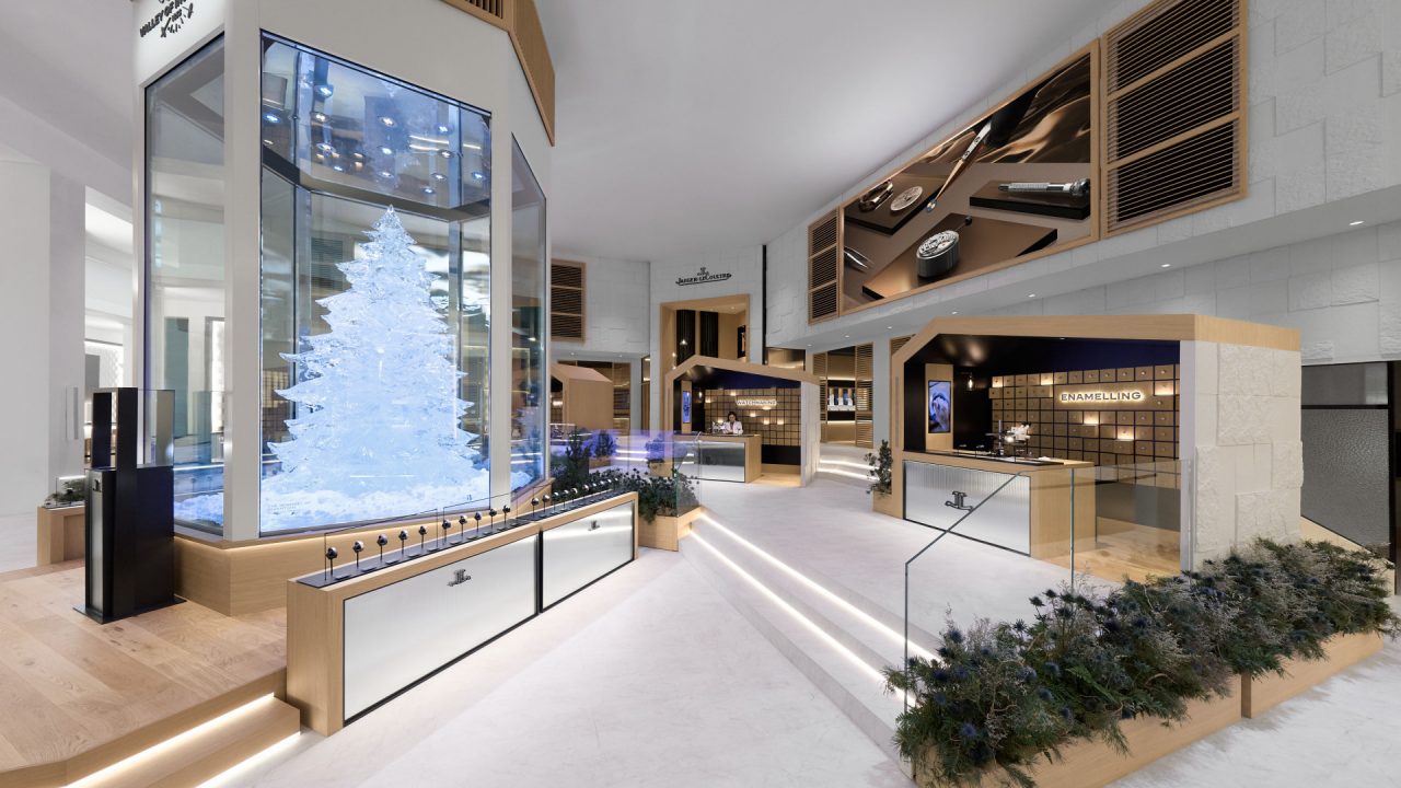 Painéis de vidro fosco e biselado dão continuidade ao tema gelado, contrastando com o calor dos materiais naturais, em particular a madeira de pinho em tons dourados, que prestam homenagem ao vale. Distribuído por três níveis, o stand convida os visitantes a mergulharem ainda mais na história da invenção e da precisão, e a descobrirem os relógios recém-lançados, bem como toda a coleção atual.