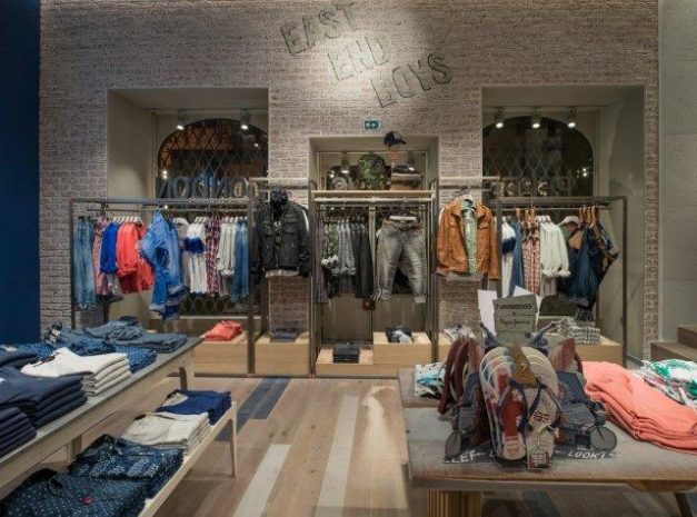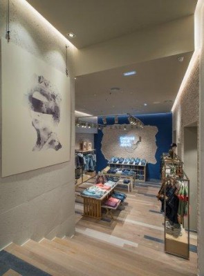 O chão mistura três tons de madeira, sendo uma delas o tom indigo, criação totalmente única e pensada pela primeira vez especialmente para as lojas Pepe Jeans.
