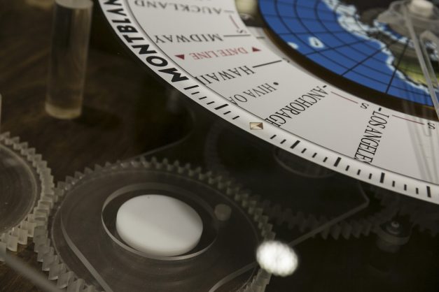 O mostrador é feito de camadas múltiplas, começando com um disco de vidro de safira principal que mostra os continentes como são vistos do Polo Norte e os nomes de 24 cidades que representam os diferentes fusos horários.
