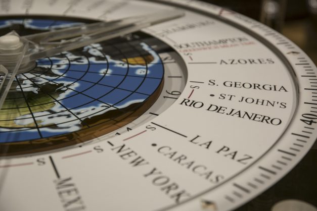 Os continentes são recortados do resto do disco, mostrando os oceanos em azul claro. Um segundo disco de cristal de safira indica a passagem de dia e de noite com um azul escuro para a noite e um degradé de amarelo e verde para o dia. Este disco também inclui o anel de 24 horas indicando as horas diferentes nas 24 cidades.