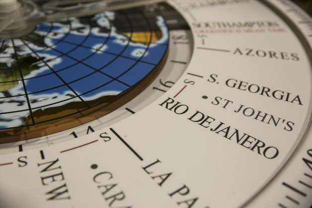 Esta configuração é realizada novamente através do botão das 8h, que muda automaticamente o ponteiro das horas, continentes, cidades, o registo de dia/noite e 24 fusos horários junto com ele. O ponteiro das horas salta em intervalos de uma hora sem afetar a precisão dos minutos. Após este simples ajuste ser realizado, a hora local do novo destino e 24 fusos horários, são totalmente sincronizados.